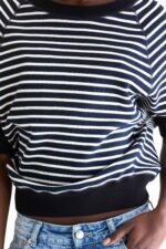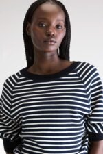 Oversized crewneck sweater with 3/4 sleeves and ribbed edges in navy blue cotton with ecru stripes.