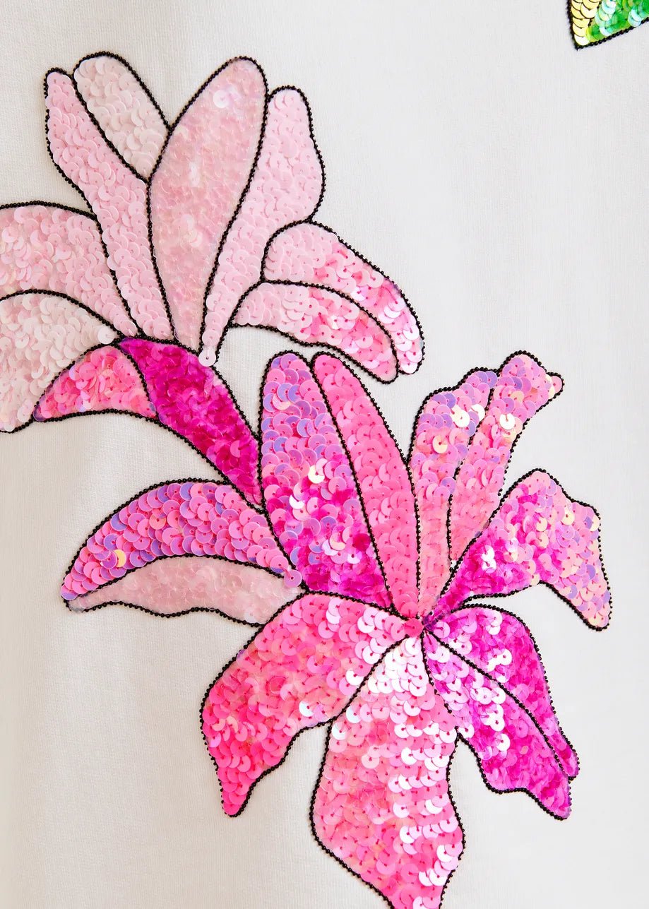 Made from soft cotton-jersey and designed for a relaxed fit, this cozy wardrobe staple features 3/4 sleeves and is adorned with vibrant floral embroidery crafted from sequins and beads.
