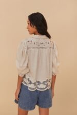 Embrace timeless elegance with our Off-White Romantic Richelieu LENZING ECOVERO Euroflax Blouse. Delicate eyelet details dance across its high neckline and puffed sleeves, creating a subtle playfulness. Crafted from responsible materials, this blouse features intricate richelieu embroidery and scalloped edges, adding unique charm. Perfect for a leisurely stroll or a casual day out, it blends effortless style with thoughtful design, inviting a touch of romance to your wardrobe.