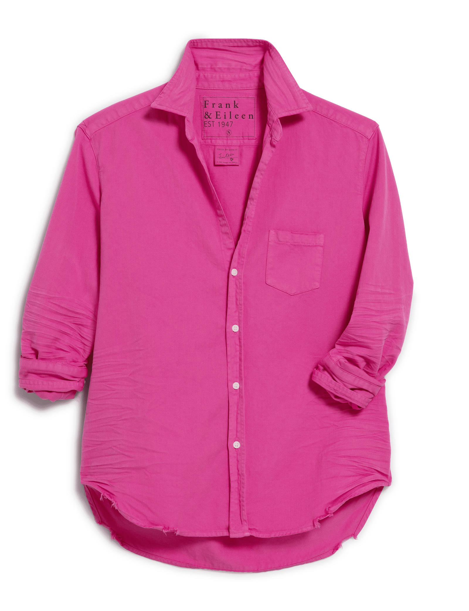 Hand-distressed raw shirttail hem long enough to cover your bumShaped like a circle with soft rounded shoulders and no back pleatChest pocketSignature bust flattering button placement and long sleeves with button cuffsPaloma is 5’9″ with a 34″ bust wearing a size SFamous Denim is hand-dyed and distressed for a one-of-a-kind garment and may vary slightly. Turn this garment inside out, machine wash on cold with like colors, and tumble dry on low. Style Code: EILEEN-RQCD
