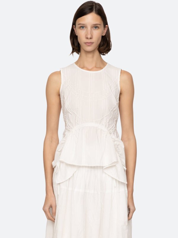 Hand-cut curved raw hem and edgesRibbed crew neckShort sleevesPullover design with no closurePaloma is 5’9″ with a 34″ bust wearing a size SStyle Code: LAB419ST-BRNR