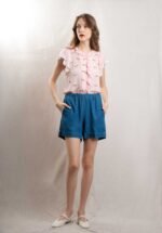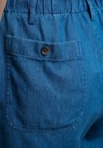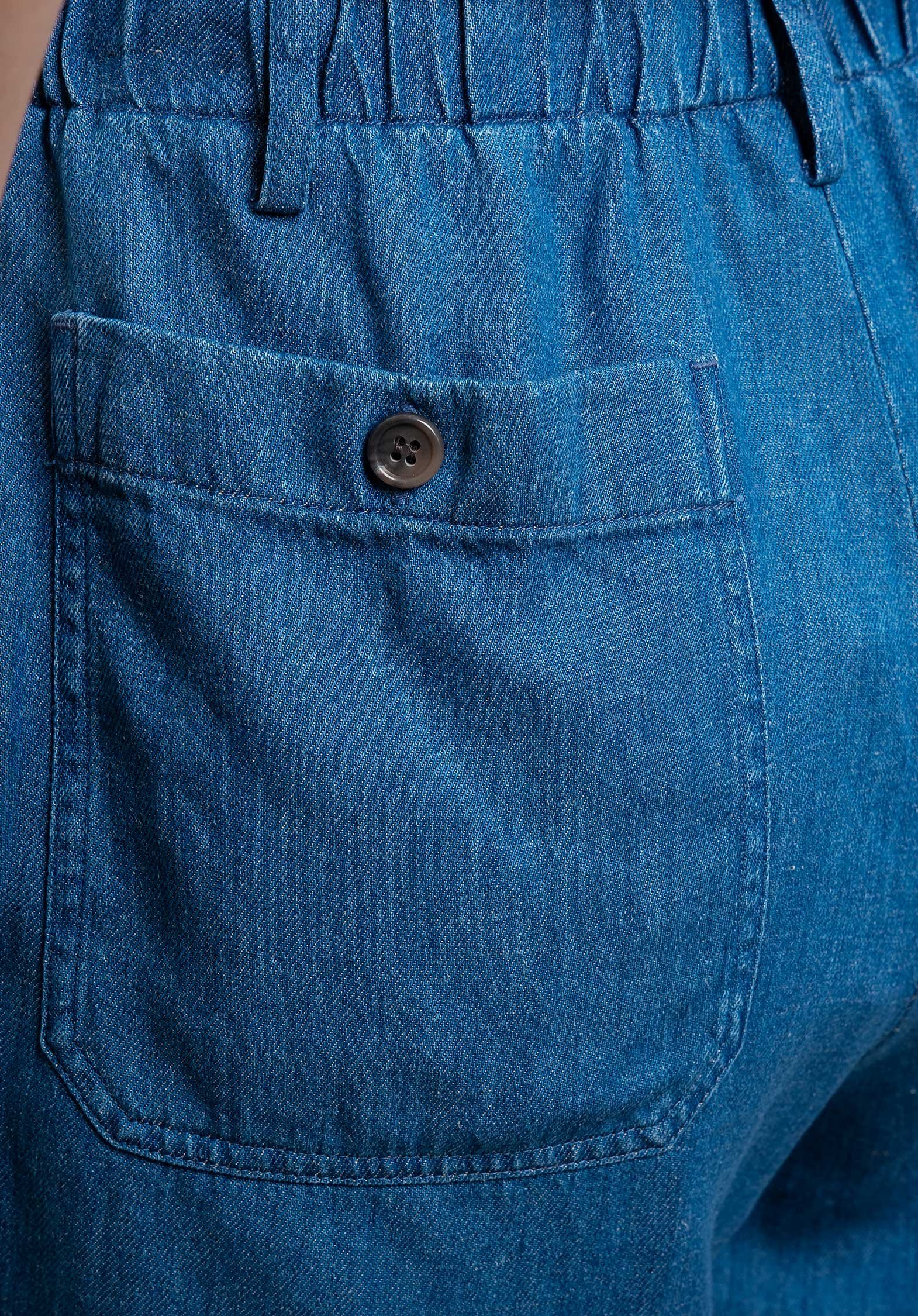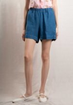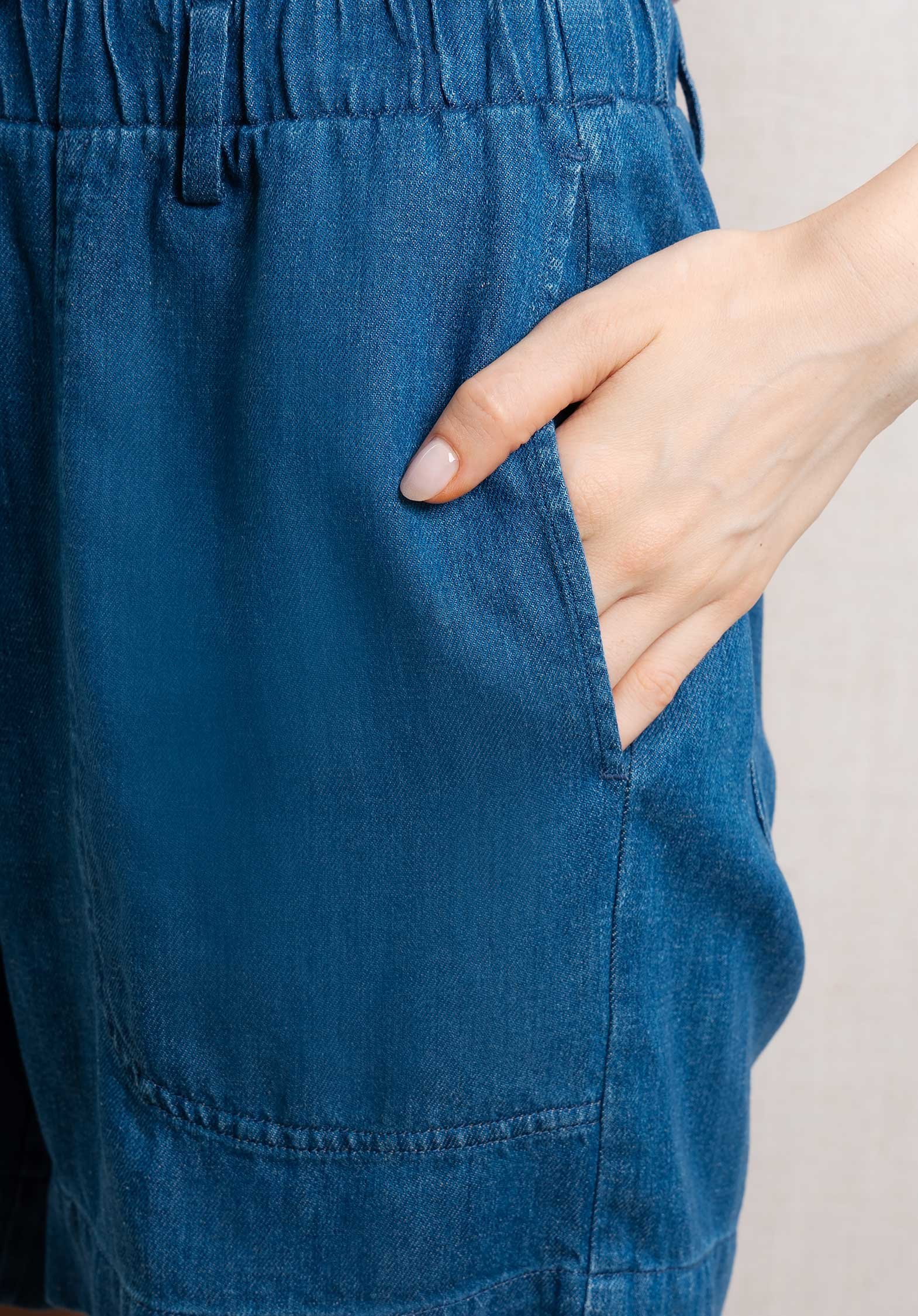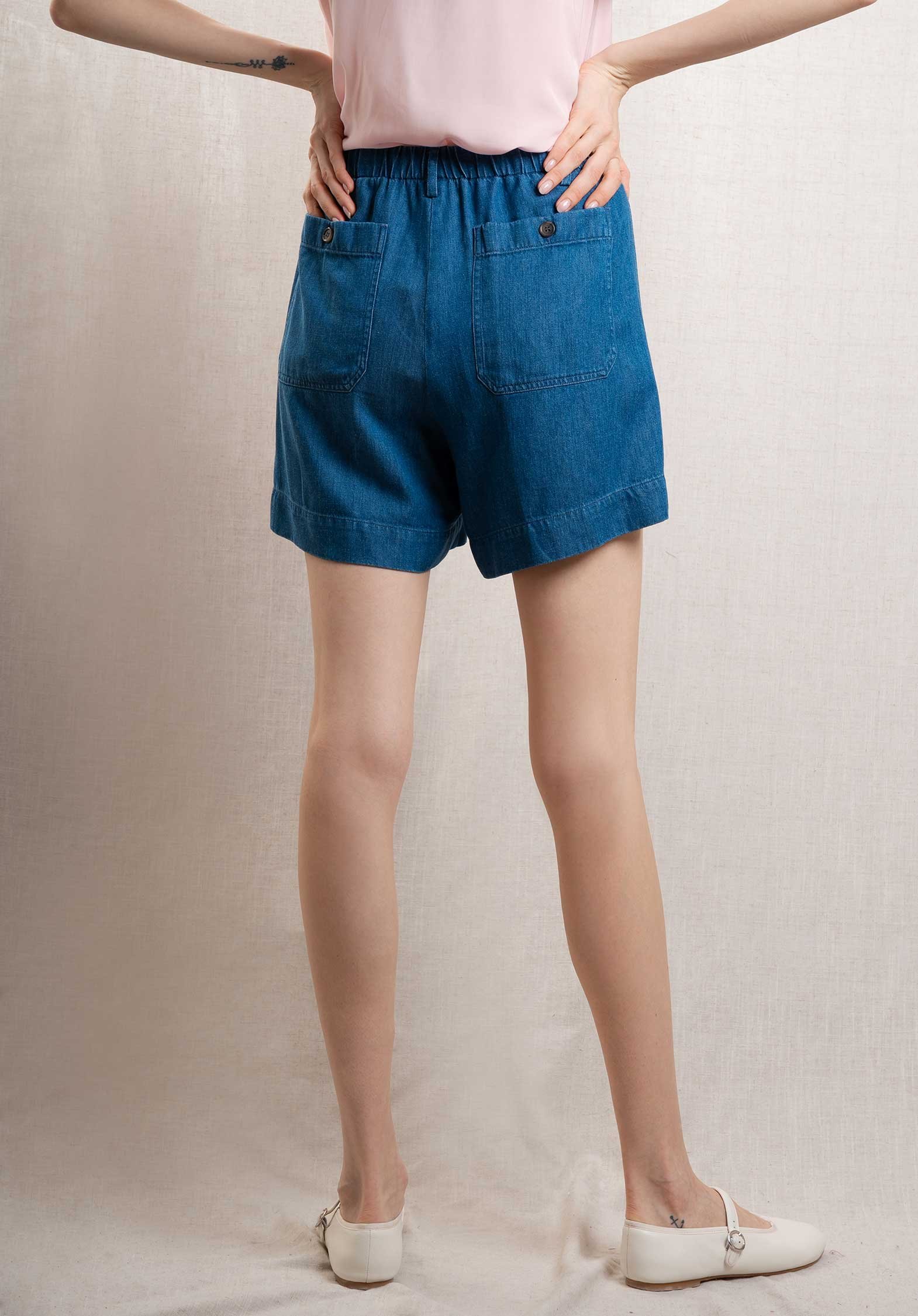 Women’s elastic-waist shorts in lyocell and linen. Two large front patch pockets and two buttoned back patch pockets.