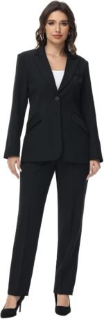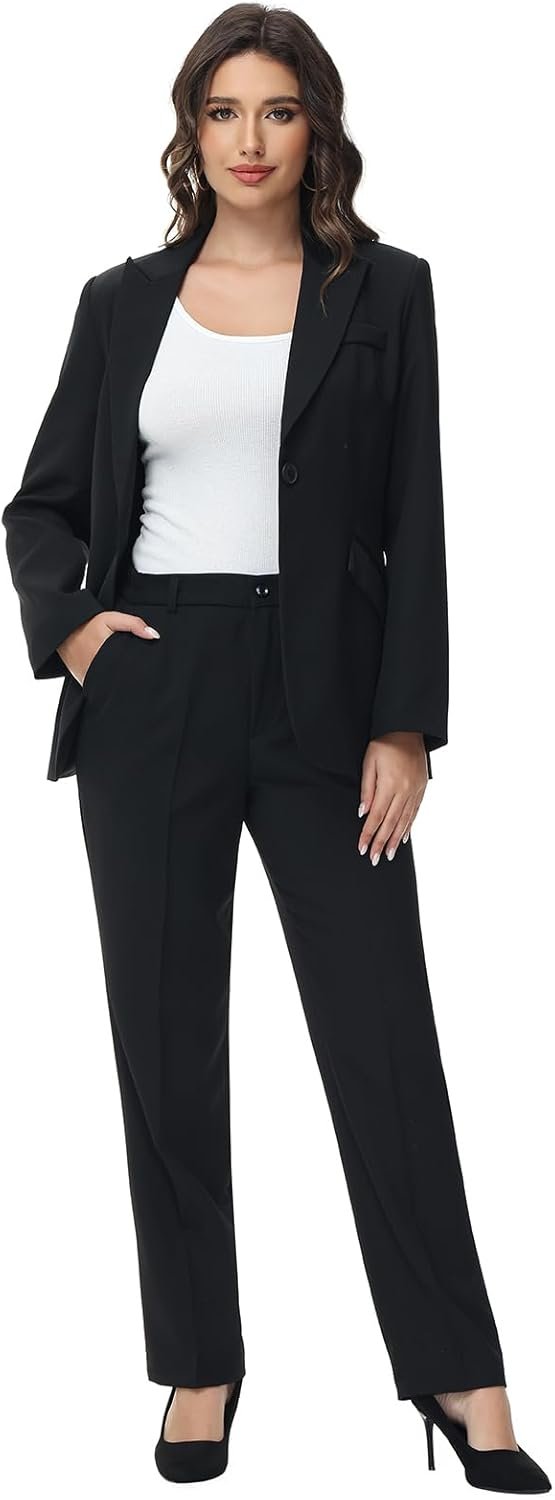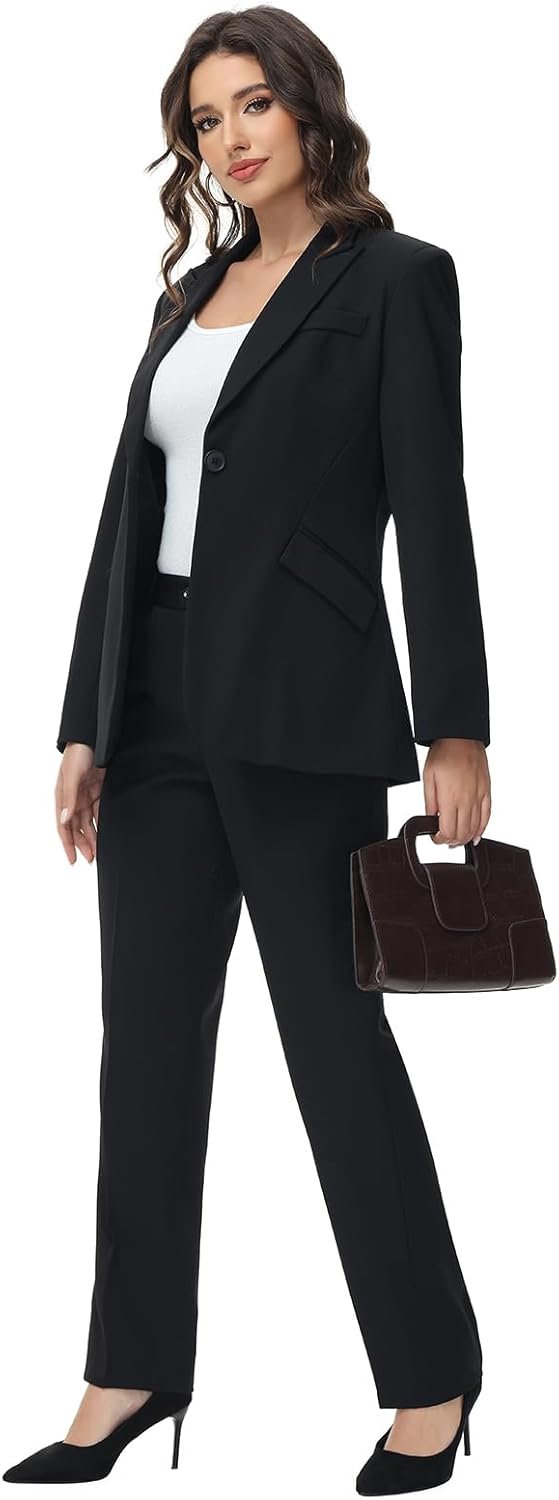 - Design: The business suit for women 2 piece sets include one button blazer has peak collar and slanted pockets, and the pants has invisible elastic waist bands and belt loops. Designed to be comfortable.