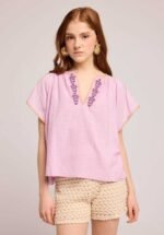 Round-neck blouse with puffed sleeves and embroidery. The colour is Lilac. 100% Viscose