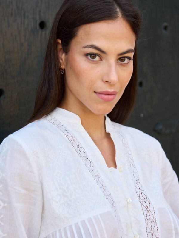 The Nellie Blouse is a delicate and timeless piece made from cotton, perfect for those looking for a bohemian style with a refined touch. Its design combines subtle embroidery on the yoke with open lace panels on the front, creating a romantic and artisanal effect. Long, slightly puffed sleeves add volume and movement, while soft pleats provide elegant structure. With small pearlescent buttons on the closure, this blouse is ideal for pairing with flowing skirts or trousers, providing versatility and freshness for any occasion.