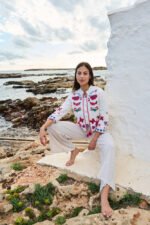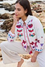 Carmela Jacket. Bohemian style. Made of light cotton, ideal for the summer season. In white, it stands out for its contrasting embroidery that gives it a unique, artisanal look. With a front closure with metallic buttons, 3/4 sleeves and a Tunisian collar that adds a distinctive touch. It has 2 pockets on the front. Contrast trim. It is recommended to go one size larger than usual. The boho style of the Carmela jacket makes it perfect to complement your looks with personality and style!