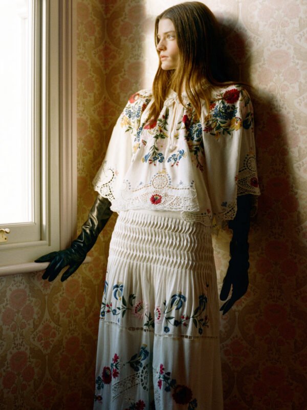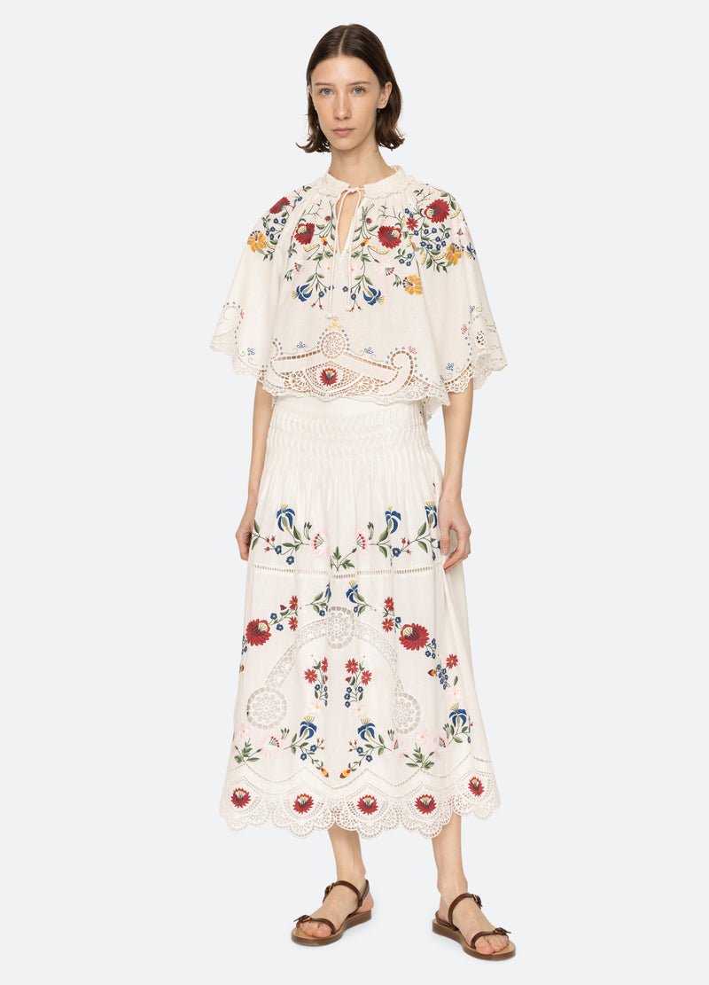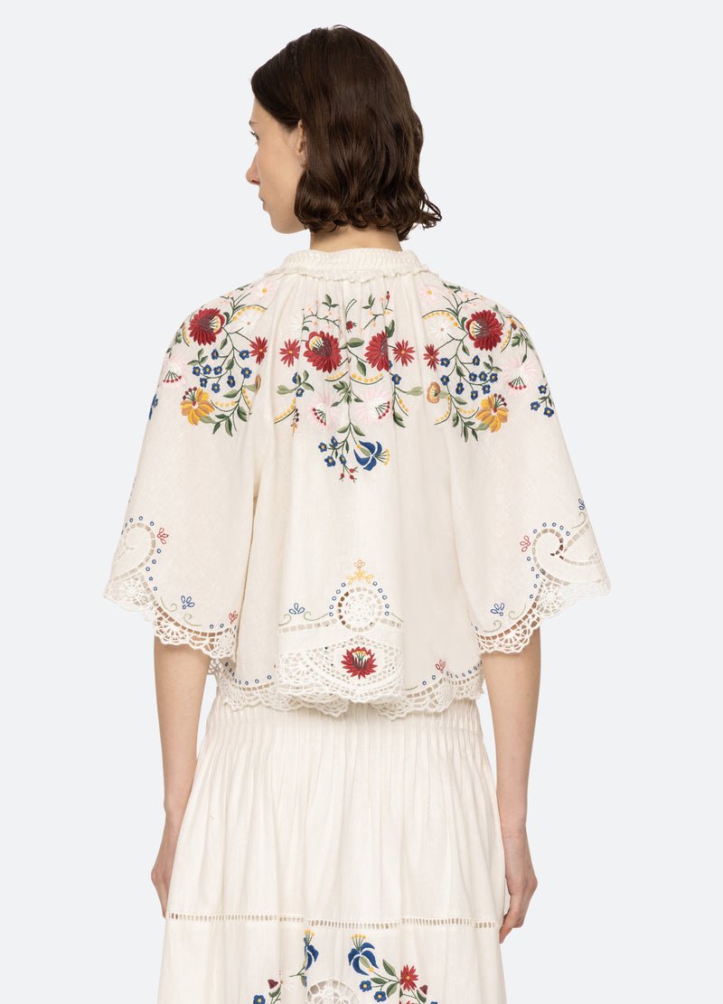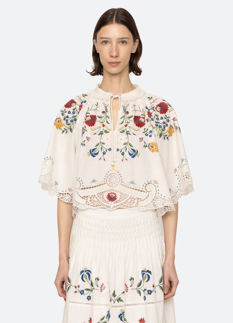The Celia short sleeve top features a harmonious blend of elegance and intricate craftsmanship. This short-sleeve top showcases detailed floral embroidery throughout, complemented by delicate lace accents. Designed with a cropped silhouette.