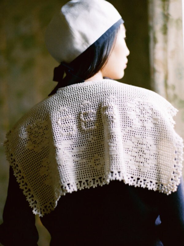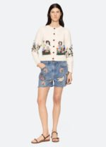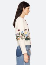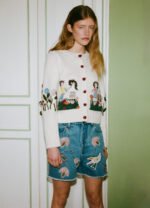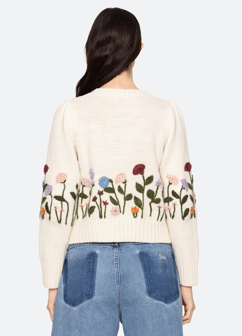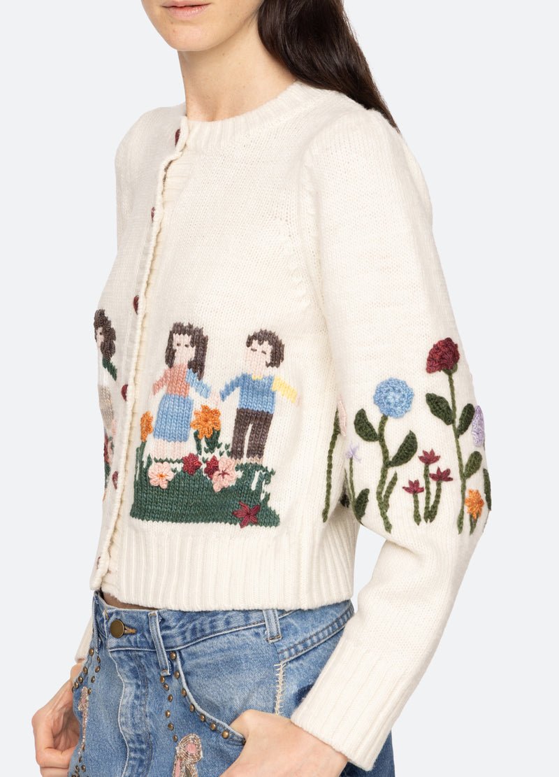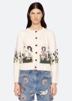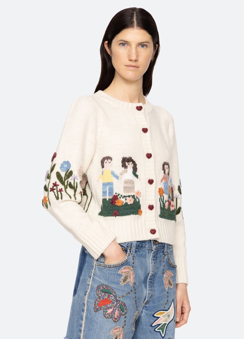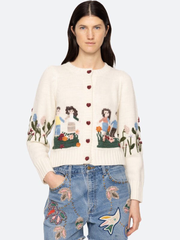 The Wendie knit cardigan features a charming fusion of classic knitwear and whimsical design. This cardigan features heart-shaped crochet buttons and a playful garden motif, adding a touch of playfulness to its classic silhouette.