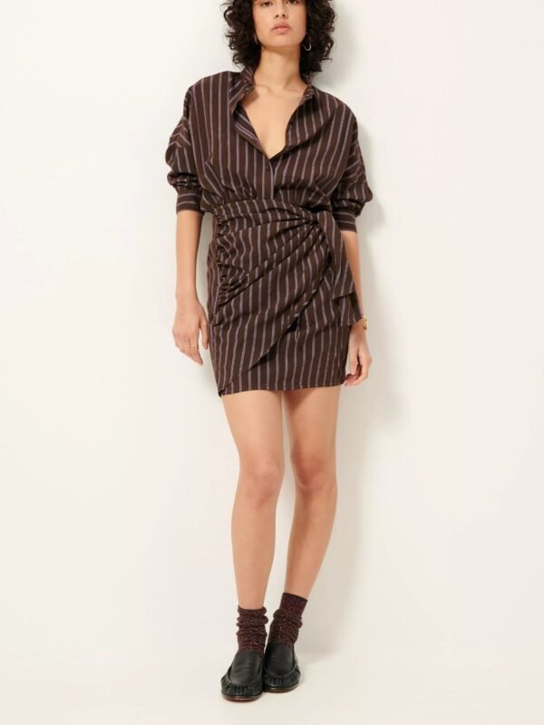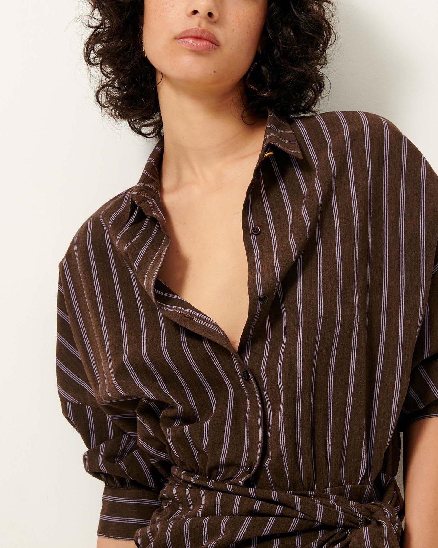 Short Shirt Dress with a tie wist in a striped, textured chin Thread Lawn Fabric, Woven in Italy.