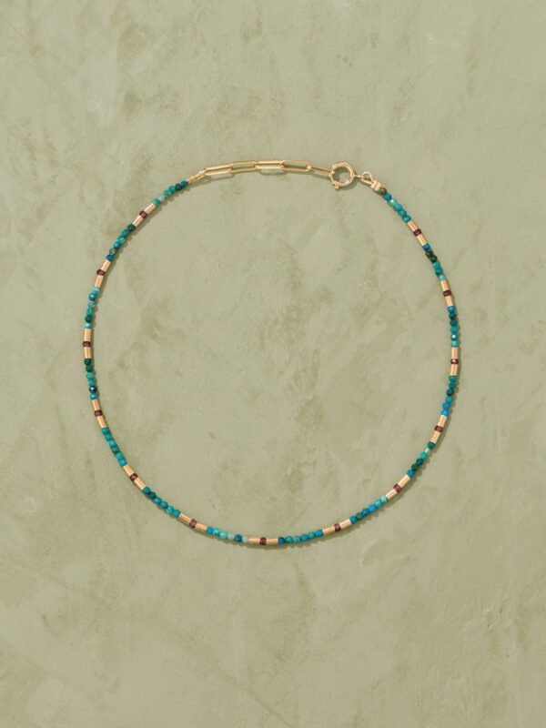 The SEDA necklace is reinvented in a malachite version. Malachite, with its hypnotic streaks of deep green, stands out as a stone of character. Its intense shades, oscillating between emerald and forest, capture the richness of nature and give it a mystical aura.