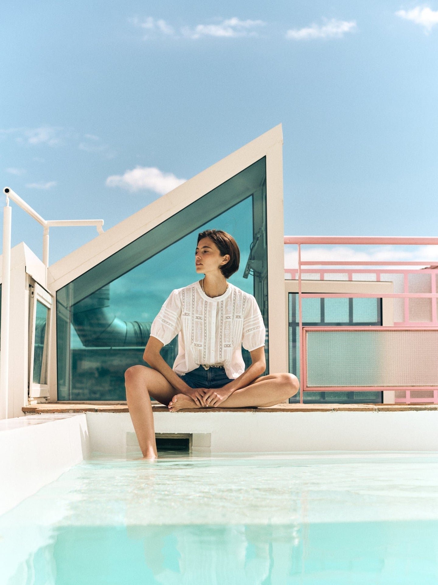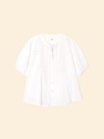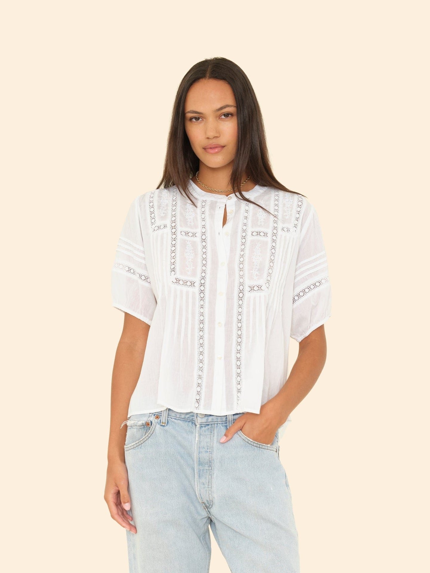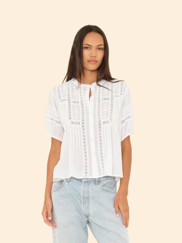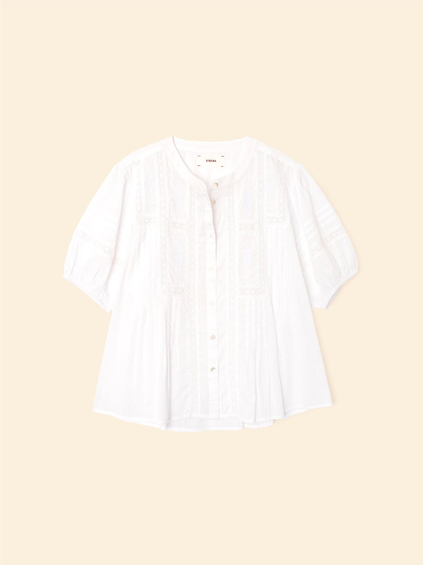 Picture Perfect. Claudia is new this season in our superfine cotton voile with a soft hand. This femme button-front shirt features puff sleeves, floral embroidery, lace trim, pintucks, and a shirred back yoke.