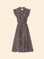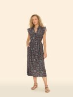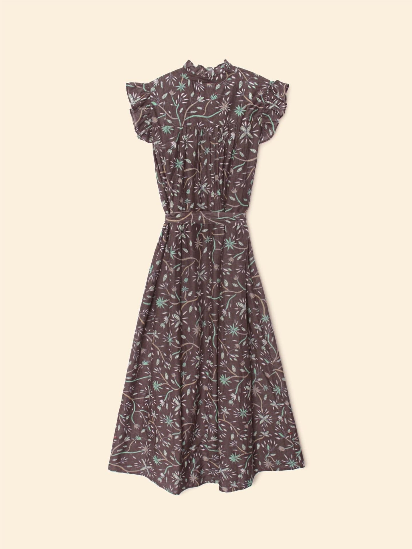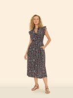 Blooming Marvelous. April is new this season in our vintage-inspired cotton silk voile floral print. April is a fully lined midi dress with ruffle details throughout the neck, front placket, and sleeves. This dress also features a partial button-front, side seam pockets, and a self-tie wrap waist.